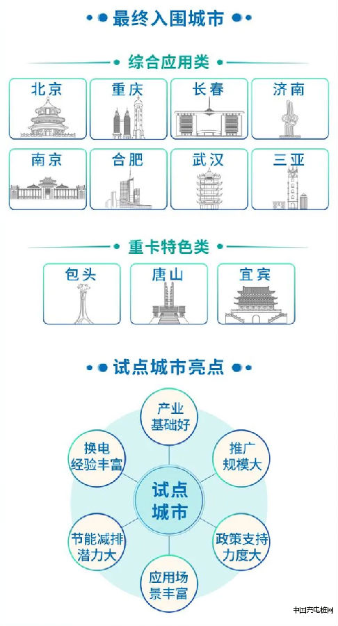 在各城市申报和省级主管部门审核基础上,经形式审查、专家材料评审、视频答辩评审,综合确定了此次试点城市名单。最终,纳入此次试点范围的城市共有11个,其中综合应用类城市8个(北京、南京、武汉、三亚、重庆、长春、合肥、济南),重卡特色类3个(宜宾、唐山、包头)。