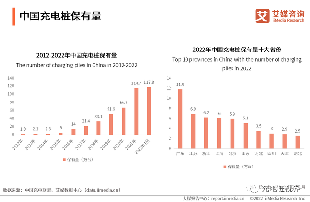 数据显示,中国充电桩保有量从2012年以来,呈现出高速增长的趋势,截止到2022年1月,中国充电桩保有量达到117.8万台,以及中国充电桩保有量最多的三个省份分别为:广东省、江苏省和浙江省。