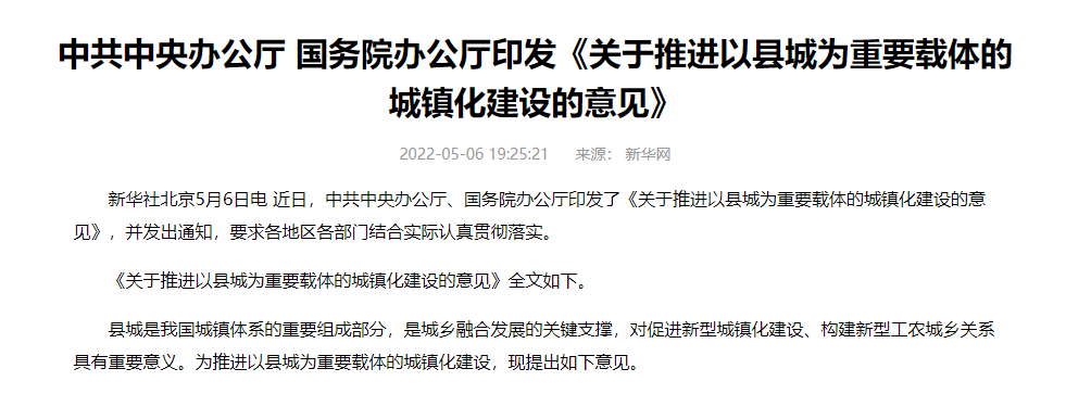 互联网 据新华社5月6日消息,近日,中共中央办公厅、国务院办公厅印发了《关于推进以县城为重要载体的城镇化建设的意见》。
