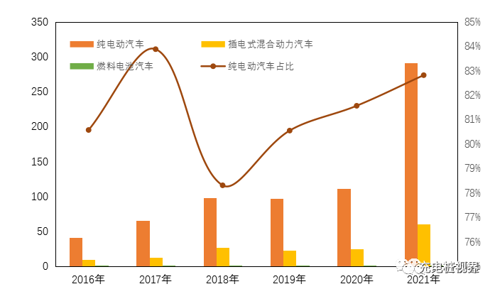 从不同动力类型的新能源汽车来看,纯电动汽车较2020年有进一步的发展,2021年纯电动汽车销量达到291.6万辆,同比增长161%,占比超过82%,纯电动汽车已经是新能源汽车市场的主流。2021年插电式混合动力汽车销量为60.3万辆,较2020年也有较大幅度的提升,同比增长140%。燃料电池汽车仍在市场中占据较小的比例。