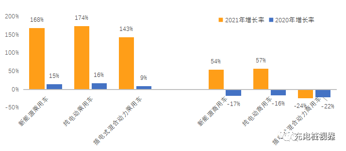 结合新能源汽车用途类型来看,新能源乘用车销量的增长水平更为突出,新能源汽车乘用车2021年销量较2020年增长167.5%,新能源商用车销量较2020年增长54%。与2020年的增长率相比,新能源乘用车增长了153个百分点,其中不论是纯电动乘用车还是插电式混合动力乘用车,均有较为显著的增速加快的情况。新能源商用车较2020年有较为明显的改善,其中主要表现在纯电动商用车从2020年的负增长变为2021年的正向增长。