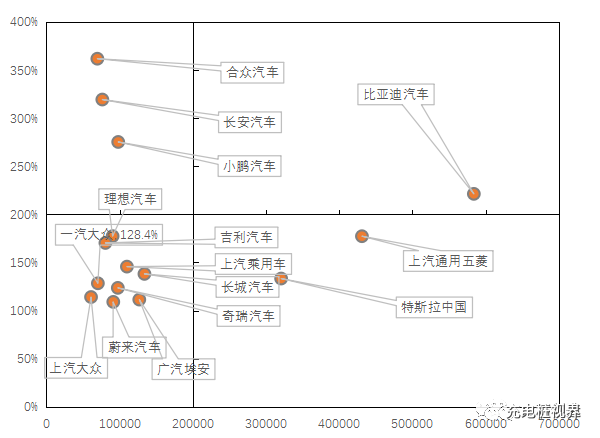 造车新势力中小鹏、蔚来、理想的零售销量在9万到10万之间。增长率方面,新能源乘用车零售销量top15企业的零售销量增长均在100%以上,其中超过200%的企业有四家,分别是合众汽车、长安汽车、小鹏汽车、比亚迪汽车。