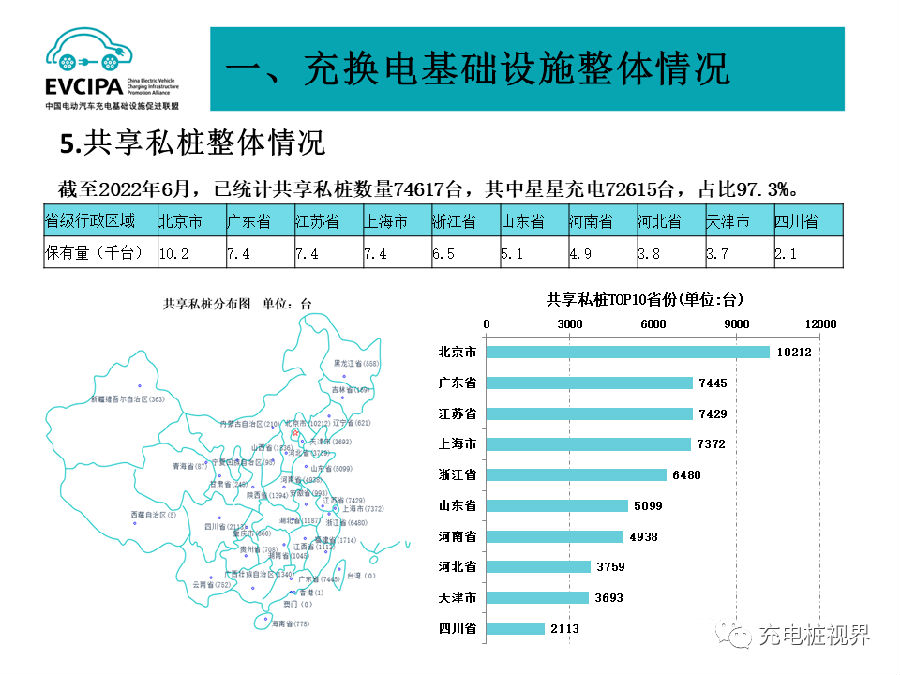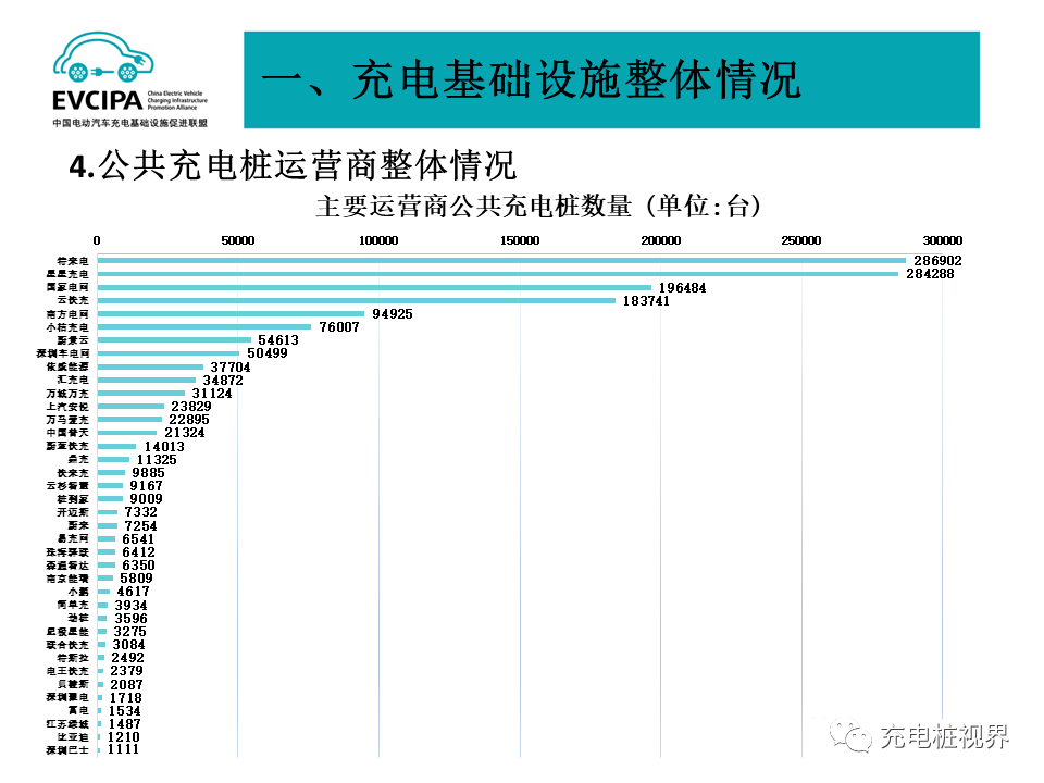 公共充电基础设施运营商运行情况,截止到2022年6月,全国充电运营企业所运营充电桩数量TOP15,分别为:特来电运营28.7万台、星星充电运营28.4万台、国家电网运营19.6万台、云快充运营18.4万台、南方电网运营9.5万台、小桔充电运营7.6万台、蔚景云运营5.5万台、深圳车电网运营5.0万台、依威能源运营3.8万台、汇充电运营3.5万台、万城万充运营3.1万台、上汽安悦运营2.4万台、万马爱充运营2.3万台、中国普天运营2.1万台、蔚蓝快充运营1.4万台。这15家运营商占总量的92.5%,其余的运营商占总量的7.5%。