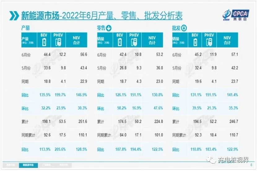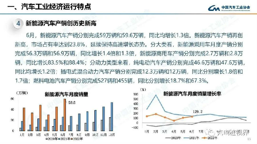 不过,冲击之下的新能源汽车市场却逆势升温,保持了产销量的稳健攀升。中汽协公布的数据显示,6月,国内新能源汽车产销分别完成59万辆和59.6万辆,同比均增长1.3倍,再创新高,市场占有率达到23.8%,延续保持高速增长态势。