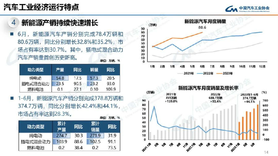2023年6月,全国新能源汽车销量80.6万辆,市场渗透率30.7%。其中纯电动汽车销售57.3万辆、插电式混合动力23.2万辆、燃料电池汽车0.10万辆。 2023年6月份充电设施建设情况 2023年6月,中国充电联盟内成员单位总计上报公共充电桩214.9万台,其中直流充电桩90.8万台、交流充电桩124.0万台,6月期间新增公共充电桩约6.5万台。 公共充电桩运营商整体情况:截止到2023年6月,全国充电运营企业所运营充电桩数量TOP15,分别为:特来电运营42.8万台、星星充电运营39.2万台、云快充运营34.4万台、国家电网运营19.6万台、小桔充电运营11.6万台、蔚景云运营9.7万台、深圳车电网运营7.8万台、南方电网运营7.3万台、依威能源运营7.2万台、汇充电运营5.6万台、万城万充运营5.1万台、蔚蓝快充运营4.0万台、万马爱充运营2.9万台、上汽安悦运营2.5万台、中国普天运营2.4万台。这15家运营商占总量的94.1%,其余的运营商占总量的5.9%。
