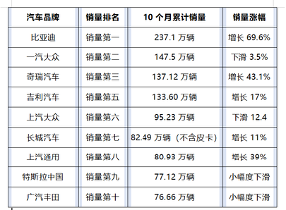 第六、第七名分别是上汽大众、长城汽车,1—10月累计销量分别为95.23万辆、82.49万辆(不含皮卡),分别同比增长-12.4%、11%。第八名、第九名、第十名分别是上汽通用、特斯拉中国、广汽丰田,1—10月累计销量分别为80.93万辆、77.12万辆、76.66万辆,除了特斯拉中国实现同比39%的增长,其他两家均出现一定程度的下滑。