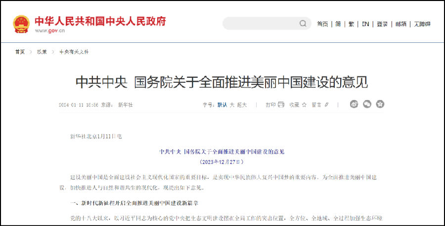 互联网 1月11日。《中共中央 国务院关于全面推进美丽中国建设的意见》发布,意见提出,建设美丽中国是全面建设社会主义现代化国家的重要目标,是实现中华民族伟大复兴中国梦的重要内容。意见要求,“十四五”深入攻坚,实现生态环境持续改善;“十五五”巩固拓展,实现生态环境全面改善;“十六五”整体提升,实现生态环境根本好转。