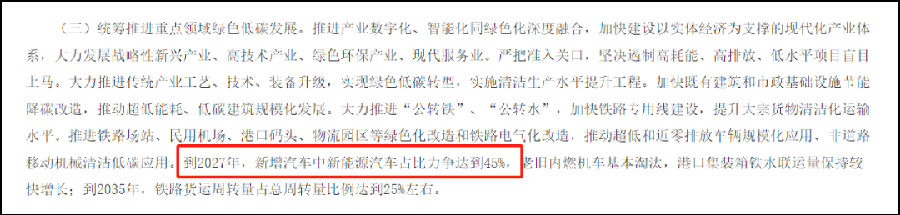 意见指出,加快发展方式绿色转型。其中提到,到2027年,新增汽车中新能源汽车占比力争达到 45%,老旧内燃机车基本淘汰,港口集装箱铁水联运量保持较快增长;到 2035 年,铁路货运周转量占总周转量比例达到 25% 左右。
